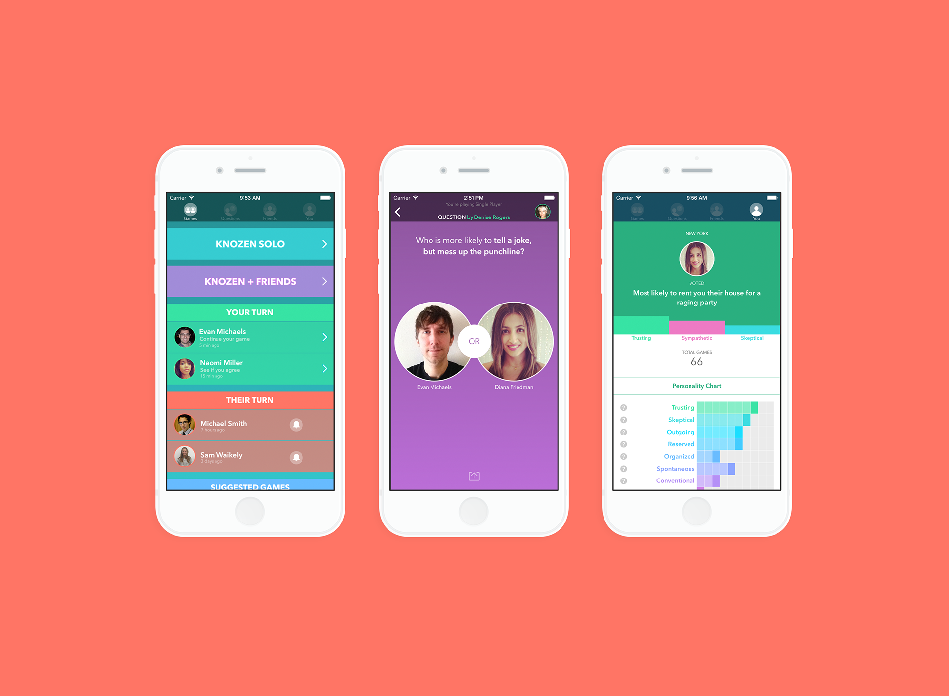Knozen v2.0-2.9 was an iOS mobile app where users answered quiz questions about their friends via asynchronous play. The answers would then feed into a personality profile where we showed compatibility, most similar friends, and other fun facts. We sunset the app and removed it from the App Store in late 2015 as the product shifted to mobile web.